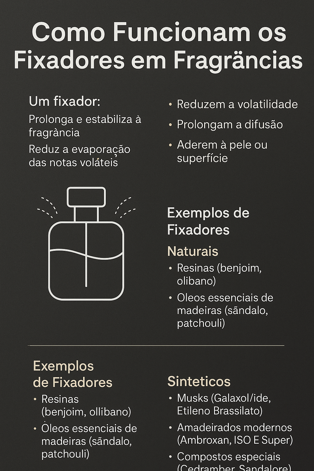 ➡️ Em resumo: sem fixadores, a fragrância desapareceria muito mais rápido.